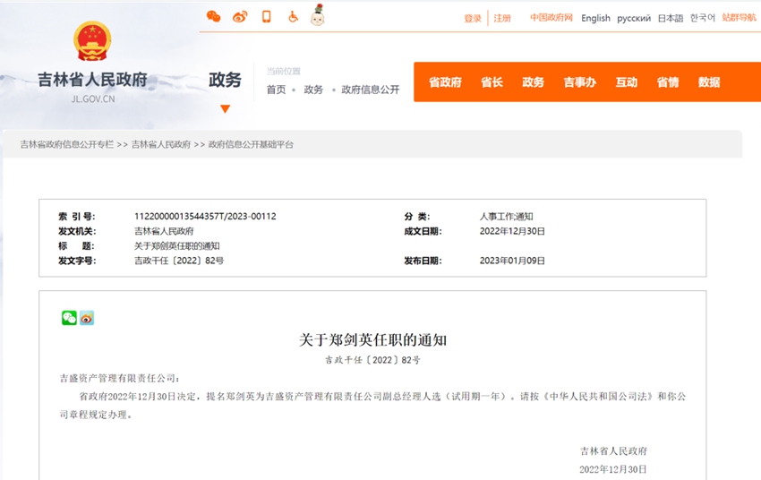 省政府2022年12月30日決定,提名鄭劍英為吉盛資產管理有限責任公司副總經理人選(試用期一年)。請按《中華人民共和國公司法》和你公司章程規定辦理。