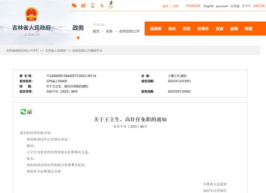 省政府2022年12月30日決定,免去王立生的吉林銀行董事長職務。