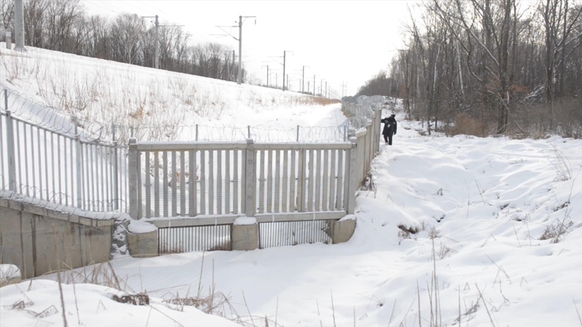 14時15分,越往前走林越密,雪地上依稀可見零亂的動物腳印。“這里經常有狍子、野豬、野兔等動物出沒,這兒得重點檢查封閉網立柱和封閉網有沒有被撞松撞壞情況。”李國君邊說邊檢查,恰在這時不遠處一只小狍子聽到響聲由封閉網旁向密林深處狂奔而去。“年三十傍晚,有4只狍子來到8號崗亭,我出去攆了幾次才離去。”
