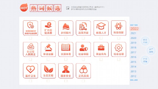 2、選擇您關注的熱詞(最多不超過10個)進行投票并回答調(diào)查問卷,參與答題越多、獲獎概率越大。