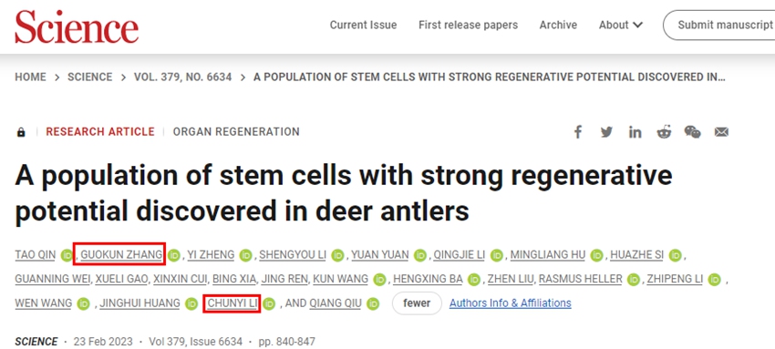 2月24日,長春科技學院鹿茸科學與產品技術研究所(下文簡稱鹿茸所)李春義教授團隊聯合西北工業大學邱強教授團隊、空軍軍醫大學黃景輝教授團隊與吉林農業大學李志鵬教授團隊,在學術期刊《Science》,在線發表題為“A population of stem cells with strong regenerative potential discovered in deer antlers”的研究成果。