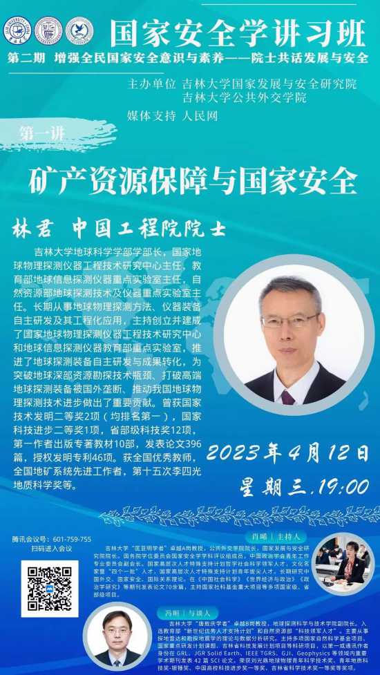 第一講邀請中國工程院院士,吉林大學地球科學學部學部長林君教授,以《礦產資源保障與國家安全》為題做講座。