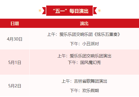 活動時間:4月30日—5月2日,具體演出情況將根據天氣安排