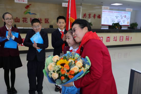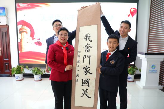 隊員徐晟竣:“吳奶奶,您用全部熱情服務身邊的人,您的奮斗精神讓我敬佩。您把居民當親人,帶領大家把社區(qū)建設得這么美,所以我寫下‘我奮斗 家國美’送給您。作為新時代的小學生,我要努力增長本領,將來像您一樣,為祖國建設貢獻自己的力量!”
