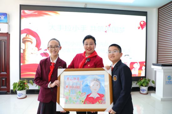 隊員王一一:“吳奶奶,花園社區(qū)在我看來,就像一座幸福的大花園,在這里花兒香,草兒綠,環(huán)境美,人們過得非常幸福,我特別想用自己的畫筆記錄下這美好的一切,留住您親切溫暖的笑容。吳奶奶,這幅畫送給你,我代表東師附小的同學們祝您身體健康,永遠年輕,永遠快樂。”