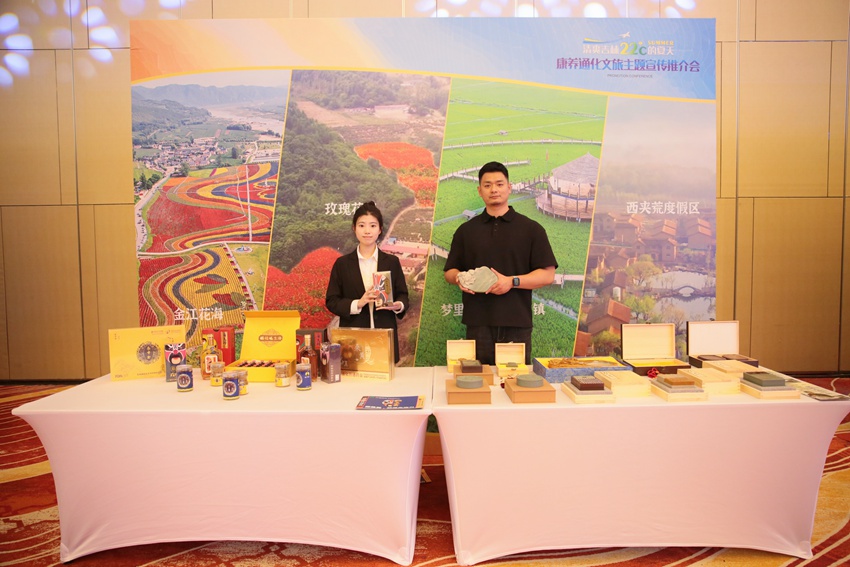 推介現場還設置了旅游商品展陳區,陳列展示了通化葡萄酒、野山參蜜膏、云嶺山參元氣水、桑黃玫瑰茶、高麗古手工人參皂等極具通化地域特色的文旅商品共9個品類、40余種。