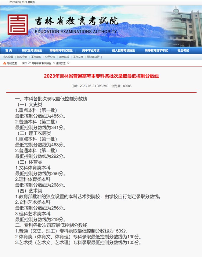 2023年吉林省普通高考本專科各批次錄取最低控制分數線公布
