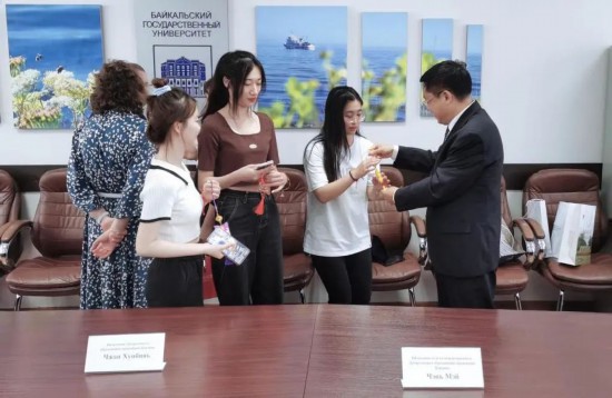 訪問活動(dòng)結(jié)束后,代表團(tuán)慰問了吉林財(cái)經(jīng)大學(xué)在貝加爾國立大學(xué)的留學(xué)生。恰逢我國傳統(tǒng)節(jié)日端午節(jié),孫杰光為同學(xué)們帶上五彩繩和香囊,表達(dá)了學(xué)校的親切關(guān)懷與節(jié)日祝福。