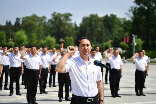 吉林省退役軍人事務(wù)廳廣大黨員在宣誓廣場重溫入黨誓詞。