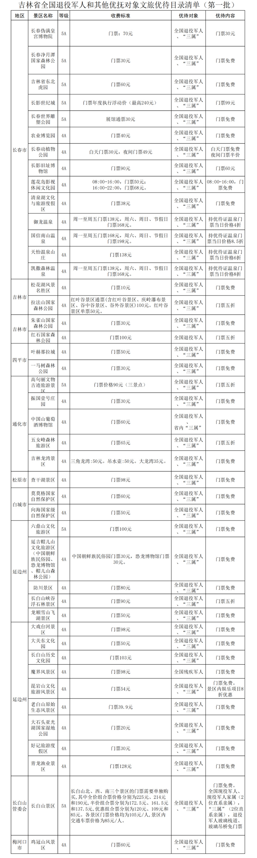 現(xiàn)將吉林省全國退役軍人和其他優(yōu)撫對(duì)象文旅優(yōu)待目錄清單(第一批)公布如下。