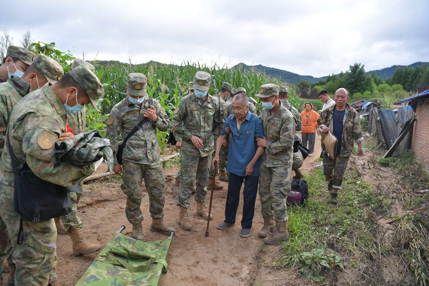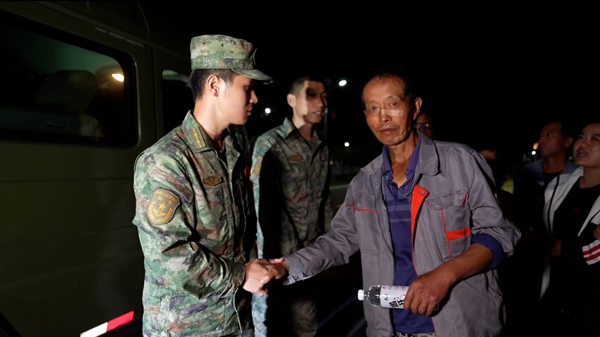 執行搜救任務的小分隊深入任務災區腹地,發現了七十四歲高齡、身患腦淤血的張大爺,他乘坐輪椅一直滯留災區。救援小分隊立即做出調整,四人輪換抬擔架,一人負責穩定張大爺情緒。七公里的山路、險路,他們足足走了五個小時,救援隊員的衣衫早已濕透。抵達安全地區后,張大爺緊握救援隊員的雙手,哭著說道:“是解放軍把我救了出來,謝謝你們。”