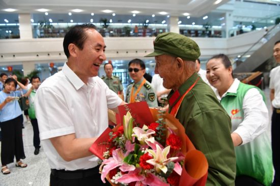 省退役軍人事務(wù)廳廳長(zhǎng)萬(wàn)春江看望參加開幕式的97歲老兵李金福