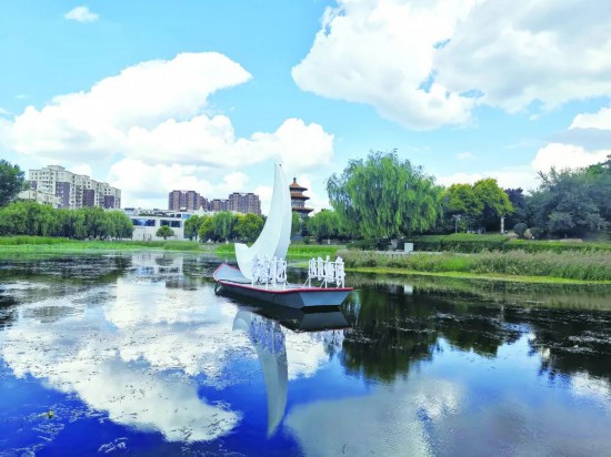 8月27日,在勞動公園內打造了以荷塘“月”色為主題的新景觀。在人工湖南側,上新了一個“彎月”的裝飾,并放置在一艘小船上,在具有北方古典風格的建筑內賞荷,看舒展開來的蓮葉從池子一直延伸到岸邊,看藍天白云,看“彎月”倒映在水中,整體感覺別有一番意境。而在人工湖北側,則上新了一個“月球“裝飾,它靜靜地矗立在湖面上,看上去更加有立體感、空間感。