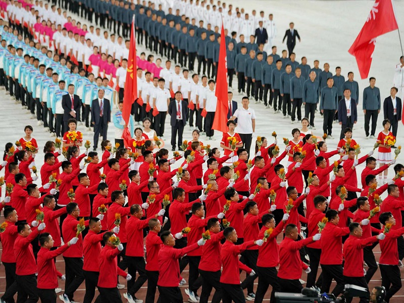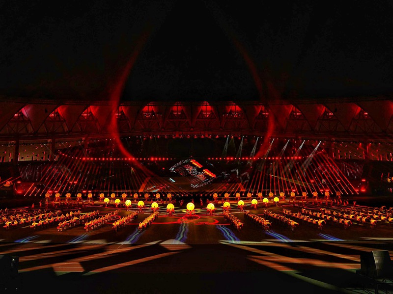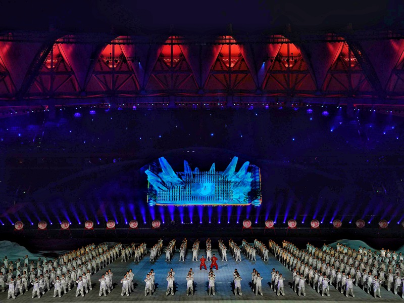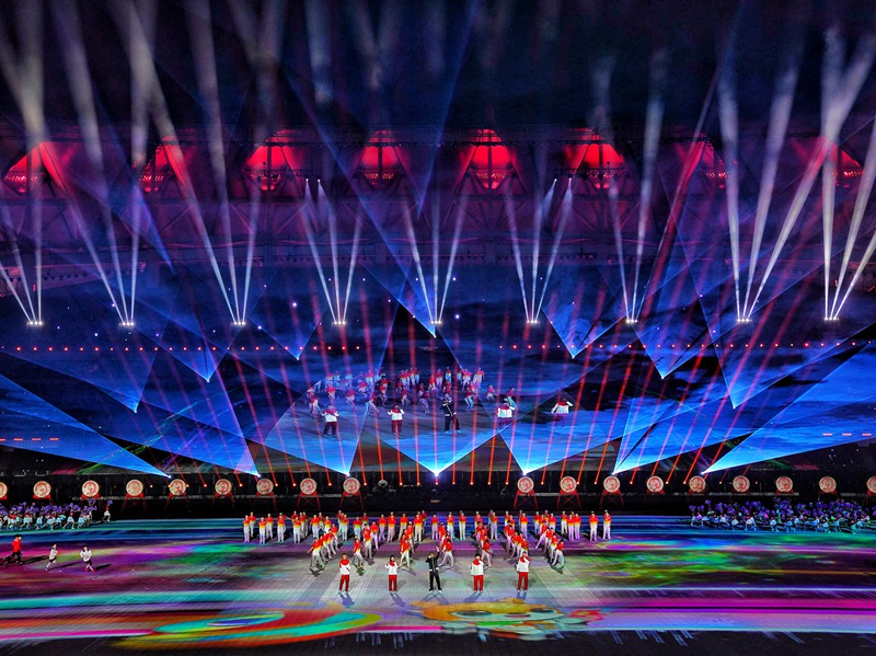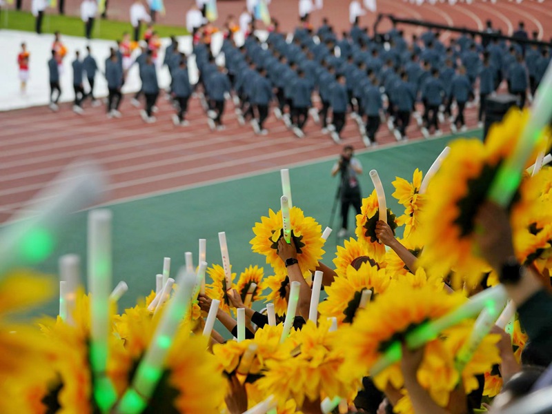 開幕式上,數千名長春市中小學生、企事業單位以及各界群眾代表獻上了一場精彩的文體演出。演出分“鼓振春城”“時代盛放”“筑夢遠航”三個篇章,通過鼓陣、太極拳、小提琴&激光燈秀、團體扇子操以及歌舞等多種形式,展現長春市民陽光健康、積極向上、拼搏進取的精神風貌。