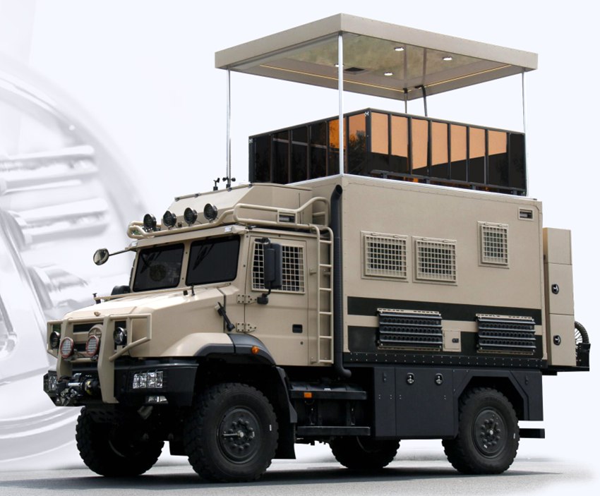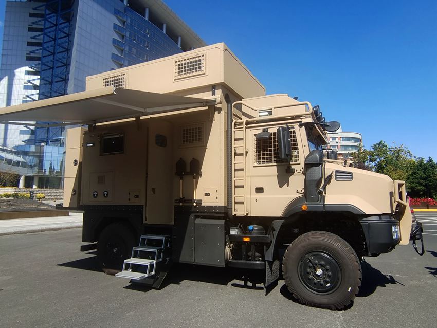 在外觀設(shè)計方面,車體噴沙漠黃涂防爆漆,廂體全部采用碳纖維、五明治保溫結(jié)構(gòu);側(cè)圍配有戶外廚房、脫困板、專用定制房車門、電動門鎖及防爆車窗。