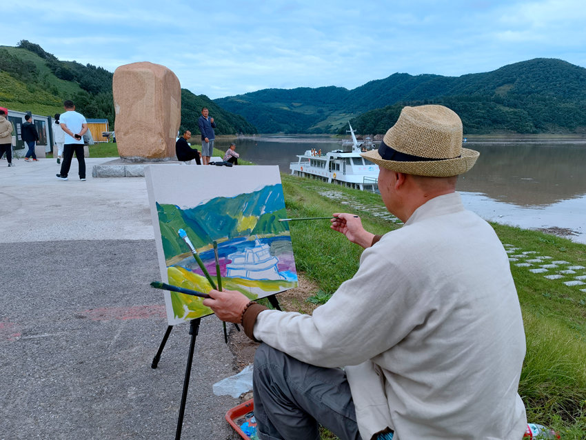 “我們兵分三路先后在靖宇縣、臨江市、撫松縣開展采風寫生創作活動。”8月30日,來自北京宋莊藝術區的藝術家們在松花江畔花園口碼頭交流作畫。“景色很好看,滿眼綠色。”“有山有水有游船,希望把吉林的美景畫下來。”