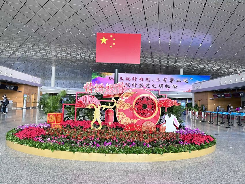 同時,為慶祝雙節到來,吉林機場集團所屬各支線機場在候機樓內開展了各具特色且豐富多彩的與客同樂活動。走進長春機場T2,位于C、B值機島間的“情滿雙節”主題彩化景觀讓人眼前一亮。航站樓出發和到達區域的問詢臺、值機柜臺、旅客服務中心、安檢通道等處,布置了上百面國旗,在航站樓的電子屏同步滾動播放節日海報,營造濃郁節日氛圍。9月29日農歷八月十五,長春機場地服“金達萊”班組以“濃情中秋,縱享華誕”為主題,舉辦第十三屆中秋嘉年華活動?;顒映酝牧餍懈枨硌萃?,還將引入民俗舞蹈、沉浸式體驗古典文化等更多帶有中華傳統文化元素的節目,致力于用多種創新性的藝術形式傳達“中國故事”。香甜可口的中秋月餅,妙趣橫生的猜字謎、填成語詩詞等互動游戲,讓旅客在中秋出行途中也能感受到傳統文化的魅力。(屈樂然)