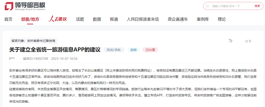 人民網(wǎng)長春10月12日電 (記者王海躍)今年中秋、國慶雙節(jié)期間,吉林省成為熱門旅游目的地,眾多省內(nèi)外游客紛紛到長白山、查干湖等景區(qū)打卡。假期過后,吉林省網(wǎng)友結(jié)合自己省內(nèi)自駕游的經(jīng)歷,在“領(lǐng)導(dǎo)留言板”向吉林省委書記提出了“建立全省旅游專項APP”的建議。