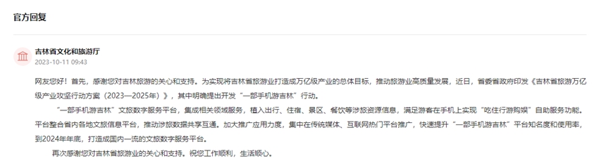 收到留言后,吉林省文旅廳回復(fù)表示,為實現(xiàn)將吉林省旅游業(yè)打造成萬億級產(chǎn)業(yè)的總體目標(biāo),推動旅游業(yè)高質(zhì)量發(fā)展,近日,吉林省委省政府印發(fā)《吉林省旅游萬億級產(chǎn)業(yè)攻堅行動方案(2023—2025年)》,其中明確提出開發(fā)“一部手機游吉林”文旅數(shù)字服務(wù)平臺的行動。這與網(wǎng)友的建議不謀而合。