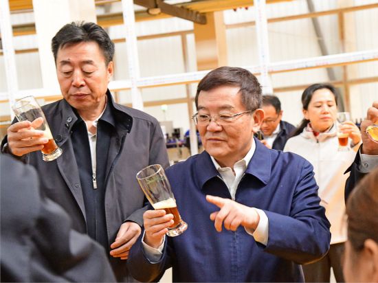 山東水發集團池南區勞德巴赫精釀啤酒廠是長白山重點招商引資項目,總投資額達3.56億元,總用地面積2.76萬平方米,總建筑面積2.87萬平方米。是山東水發集團繼山東菏澤、山東青島、四川廣元之后在國內布局的第四個啤酒廠,年產量可達10萬噸。該廠第一批產品于9月13日正式上市銷售,距今剛好一個月。徐樂江深入勞德巴赫生產車間,仔細聽取水發上善集團副總經理黃耀輝、勞德巴赫啤酒集團董事長李濤關于企業發展歷程、品牌發展戰略和精釀啤酒生產工藝的介紹。徐樂江仔細觀察工作人員遞送的啤酒色澤和酒花,試飲后,他贊嘆道:用長白山的水釀出的啤酒味道鮮美,名不虛傳。調研中,徐樂江對勞德巴赫啤酒廠負責人及員工說道:感謝你們扎根邊疆、投資邊疆,為抵邊產業發展作出的積極貢獻!并表示企業剛剛投入運行,面臨一定的困難,池南區要做好服務工作,同時此次調研之行也為企業在邊疆地區加油鼓勁,恭賀剪彩。