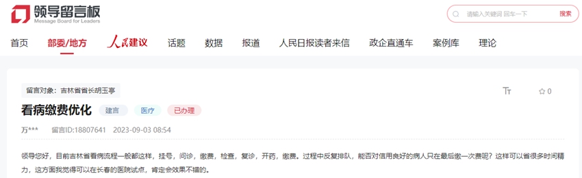 人民網長春10月16日電 (記者王海躍)近日,吉林網友在“領導留言板”給吉林省省長留言,提到目前的就醫過程反復排隊,建議優化就醫流程。“能否讓信用良好的病人只在最后一個環節一次性繳費呢?這樣可以節省很多時間精力。我覺得可以把長春的醫院作為試點,效果肯定會不錯的。”網友在留言中寫道。