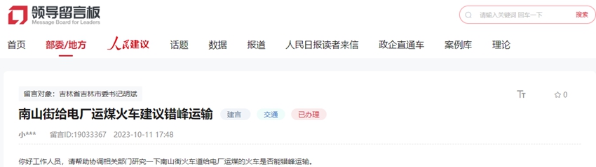人民網長春10月18日電 (記者王海躍)“你好工作人員,請幫助協調相關部門研究一下南山街火車道給電廠運煤的火車是否能錯峰運輸。”10月11日,吉林省吉林市網友在“領導留言板”給吉林市委書記留言,提出建議。