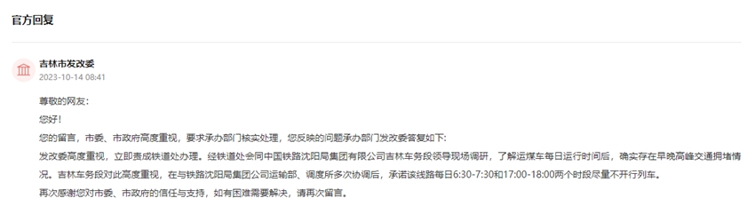 收到留言后,吉林市發改委要求承辦部門核實處理。經鐵道處會同中國鐵路沈陽局集團有限公司吉林車務段領導現場調研,了解運煤車每日運行時間后,確實存在早晚高峰交通擁堵情況。