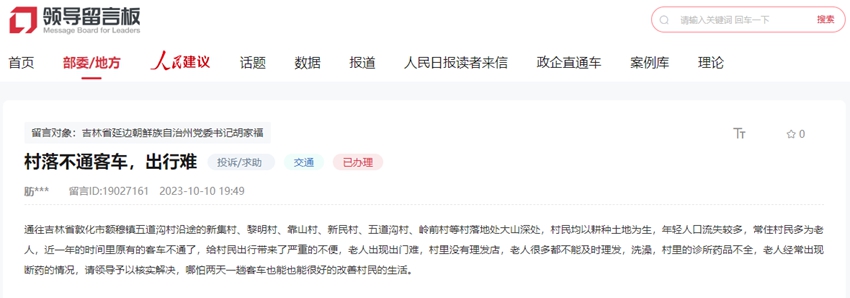 人民網長春10月19日電 (記者王海躍)10月10日,網友在“領導留言板”給吉林省延邊朝鮮族自治州黨委書記留言,反映敦化市幾個地處大山深處的村落不通客車導致村民出行難的問題。