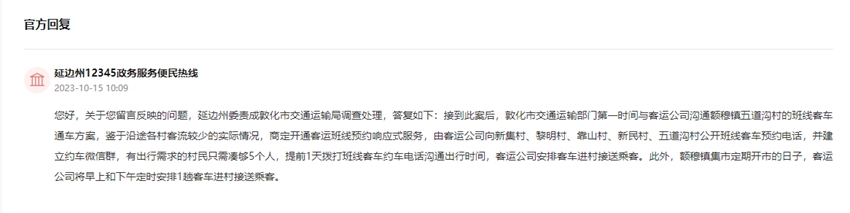 收到留言后,延邊州委責成敦化市交通運輸局調查處理。敦化市交通運輸部門第一時間與客運公司溝通額穆鎮五道溝村的班線客車通車方案,鑒于沿途各村客流較少的實際情況,商定開通客運班線預約響應式服務,由客運公司向新集村、黎明村、靠山村、新民村、五道溝村公開班線客車預約電話,并建立約車微信群,有出行需求的村民只需湊夠5個人,提前1天撥打班線客車約車電話溝通出行時間,客運公司安排客車進村接送乘客。