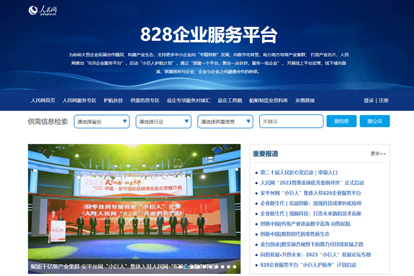 人民網(wǎng)是“網(wǎng)上的人民日報”,媒體傳播矩陣目前覆蓋8.2億網(wǎng)友,憑借著強大的影響力以及秉持“權威、公正、客觀”的新聞價值觀,為廣大網(wǎng)民提供豐富多樣的信息服務。為更好支持中小企業(yè)發(fā)展,人民網(wǎng)于2022年推出“828企業(yè)服務平臺”,啟動“小巨人護航計劃”。通過“搭建一個平臺,聚合一眾伙伴,服務一批企業(yè)”,開展線上平臺運營、線下資源對接等,致力于幫助更多中小企業(yè)向專精特新“小巨人”企業(yè)的轉變,構建政府與企業(yè)、企業(yè)與企業(yè)之間融通合作的橋梁,助力大中小企業(yè)的融通發(fā)展和地方產業(yè)名片打造,實現(xiàn)培育更多專精特新“小巨人”企業(yè)的目標。