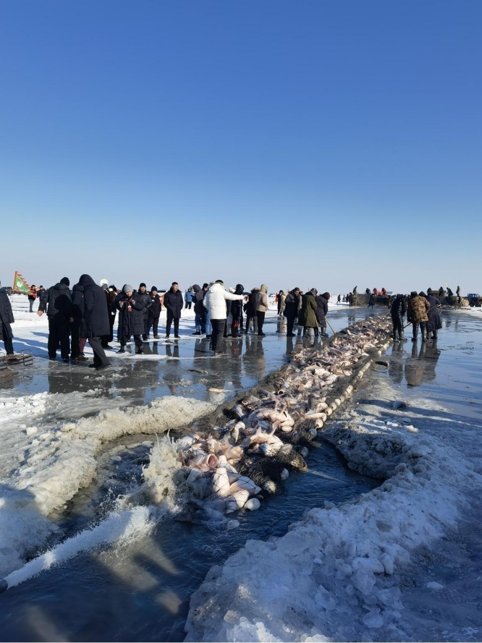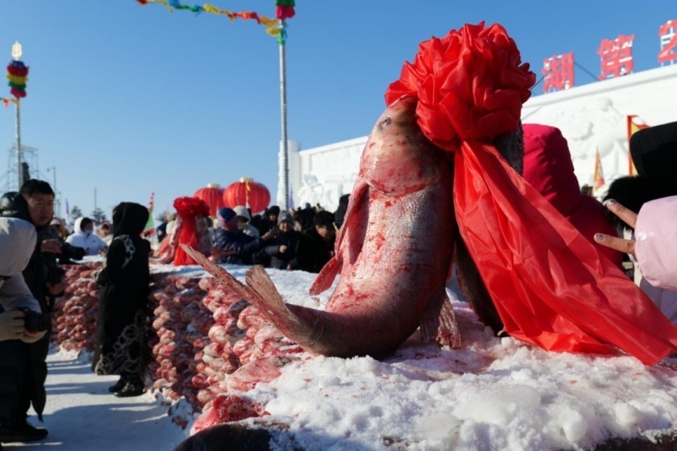 開幕式后,人們則興致勃勃地趕往出魚口,觀冬捕、賞鮮魚、購大魚,感受無比震撼的“冰湖騰魚”盛景。