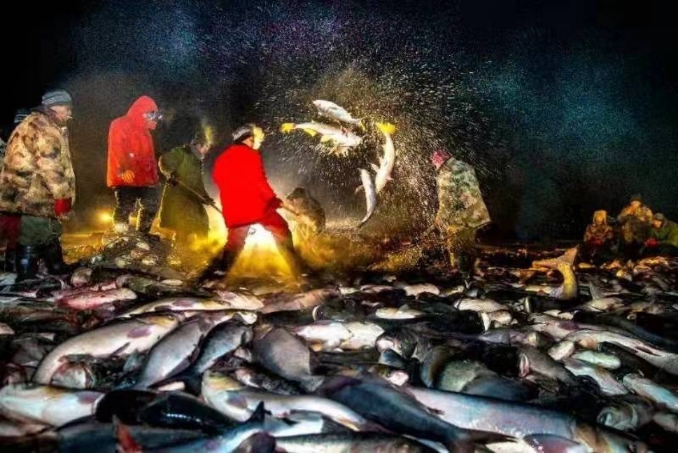 數九寒天,4匹健碩的馬拉著絞盤打轉,胖頭魚、鳙魚、草魚、鰱魚……漁網在冰上好似一條生產線上的傳送履帶,數萬尾鮮魚源源不斷地出湖,在冰湖上彈跳起舞。