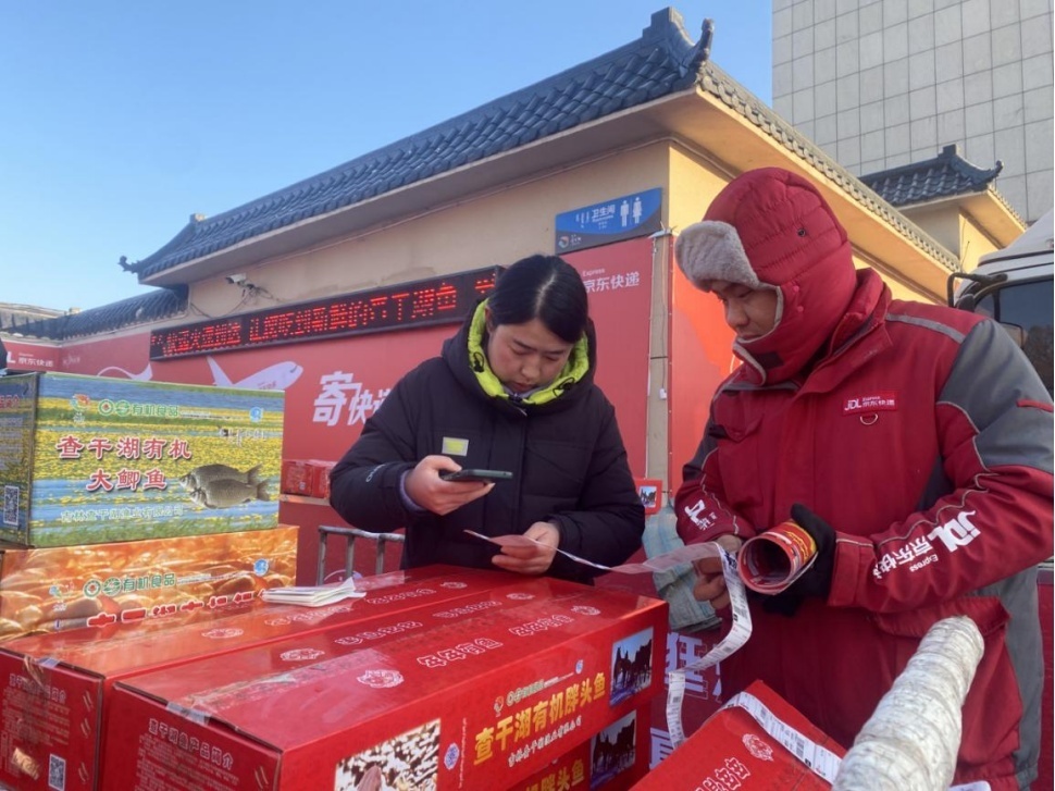 曲三妹領記者走到餐館一旁的空地上,農家樂的員工正在把一條條魚稱重、打包、裝箱,空地的一側已經密密麻麻摞著一大批查干湖胖頭魚的快遞箱,“現在冬捕剛剛開始,每天可以寄出幾十條大胖頭魚。按往年的經驗,再過一陣,每天得寄出幾百條魚呢?!鼻眯χf。“農家樂的生意紅火,周邊村屯的村民也受益。農閑之后正是冬捕季,村民可以在農家樂做服務員、打包湖魚,我們按每天120元給錢。”