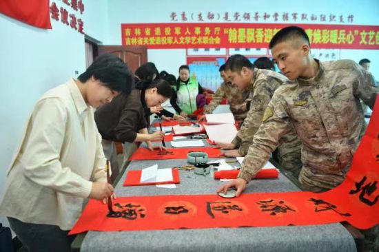 在文藝交流創(chuàng)作活動(dòng)現(xiàn)場,吉林省書法家協(xié)會、吉林省關(guān)愛退役軍人文學(xué)藝術(shù)聯(lián)合會的文藝工作者們,有的潑墨揮毫,酣暢淋漓地書寫著一副副飽含對軍人職業(yè)尊崇之情的春聯(lián);有的專心致志,精心描繪對新時(shí)代軍政軍民大團(tuán)結(jié)頌揚(yáng)之意的丹青彩繪。“捧丹心盡顯英雄本色、向未來書寫強(qiáng)軍新篇”“踔厲奮發(fā)專注練兵備戰(zhàn)、勇毅前行致力強(qiáng)軍興軍”等一幅幅描述新時(shí)代強(qiáng)軍興軍的書法、繪畫作品,飽含著文藝工作者們對人民子弟兵的尊崇和關(guān)愛之情,以藝術(shù)的形式展現(xiàn)了吉林省軍政軍民團(tuán)結(jié)的大好局面。