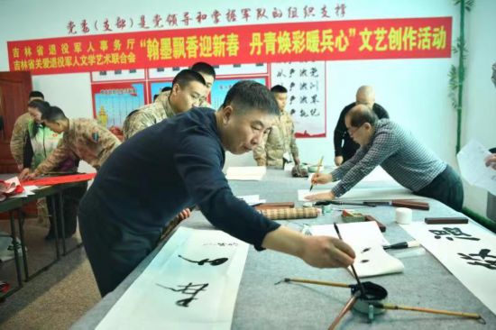 為喜迎新春佳節(jié),1月18日,吉林省退役軍人事務(wù)廳、吉林省書法家協(xié)會、吉林省關(guān)愛退役軍人文學(xué)藝術(shù)聯(lián)合會共同走進(jìn)駐長某部雷達(dá)站官兵中,開展主題為“翰墨飄香迎新春、丹青煥彩暖兵心”主題文藝創(chuàng)作活動(dòng)。中國書法家協(xié)會、吉林省書法家協(xié)會的理事、會員和來自長春市柏合暖兵服務(wù)隊(duì)志愿者代表、長春市退役軍人代表等共計(jì)110余人參加活動(dòng)。