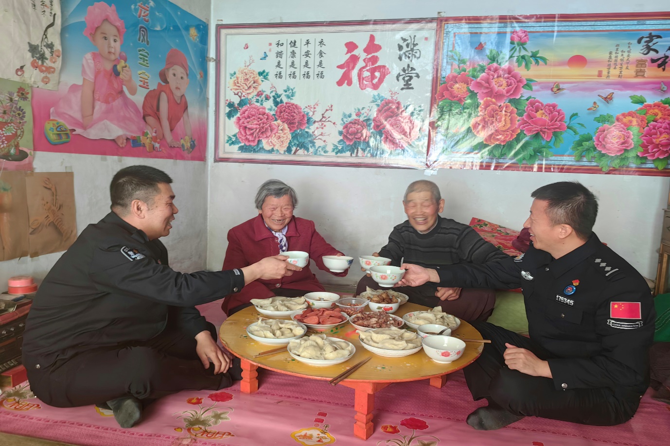 餃子出鍋嘍!民警和郝大爺郝大娘在炕桌上圍坐一團,吃著餃子拉著家常,“看到你們,就跟看到我們孩子們回來一樣,高興啊!”郝大娘一邊吃著餃子一邊笑著說道。