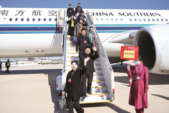 3月3日,帶著為民履職的神圣使命,出席十四屆全國人大二次會議的吉林省全國人大代表乘飛機抵達北京。(記者鄒乃碩 攝)