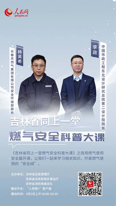 本次安全科普大課將由長春天然氣集團(tuán)有限公司安全環(huán)保部部長韓昊希和中國市政工程東北設(shè)計研究總院第二設(shè)計院院長李政主講,網(wǎng)友可下載“人民網(wǎng)+”客戶端或關(guān)注人民網(wǎng)吉林抖音號收看。