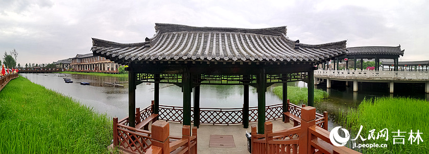 人民網琿春6月13日電 (記者王帝元)昨天一早,雖是陰雨綿綿,卻也格外涼爽。在吉林省延邊朝鮮族自治州琿春市敬信鎮防川村,朝鮮族風格的建筑屋頂的兩端向上翹起,形成飛檐,水鳥落在上面悠然自得;走在亭臺水榭間,無意驚起的水鳥又落于旁處;遠處的山巒在霧氣間若隱若現,縹緲而神秘。