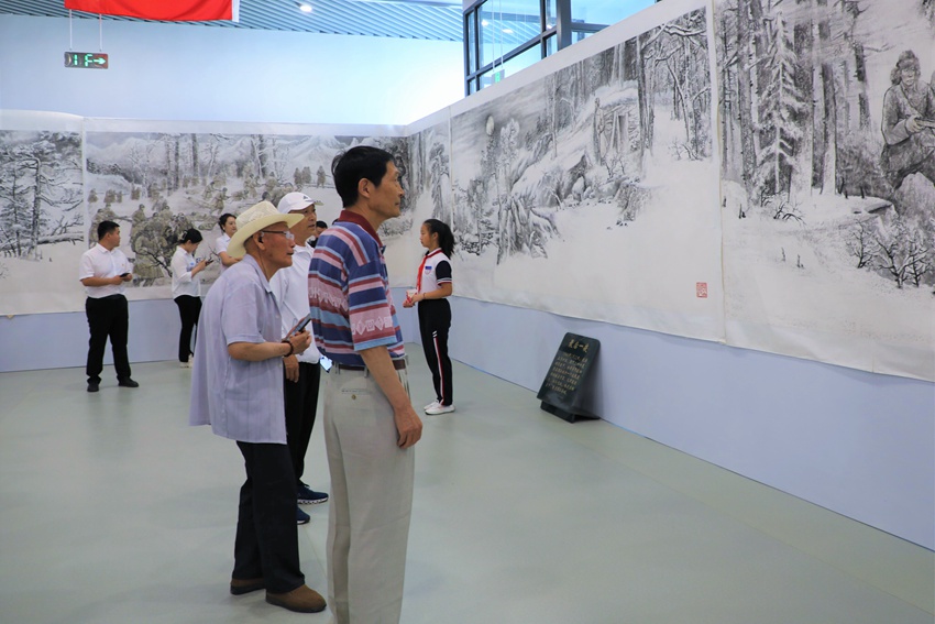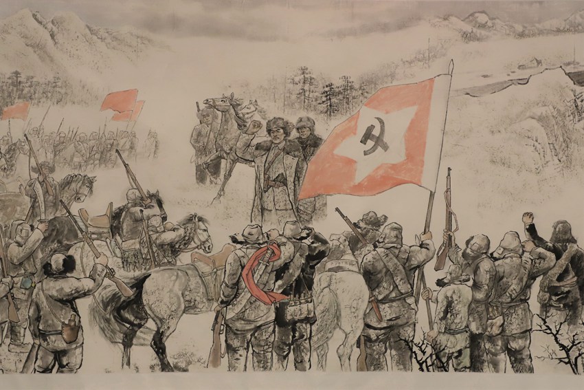 據介紹,百米組畫《人民英雄楊靖宇》作品是為慶祝中華人民共和國成立70周年,中國共產黨成立100周年,歷時一年多時間創作而成的,整幅畫卷全長108米,由13個篇章組成,全景再現了人民英雄楊靖宇創建東北抗日聯軍第一軍和第一路軍,領導人民在白山松水間反抗日偽殖民統治的光輝歷程。作品以水墨畫為表現形式,刻畫了楊靖宇將軍的光輝形象,闡釋和弘揚了楊靖宇精神,是新時代思政課的好內容、新形式。