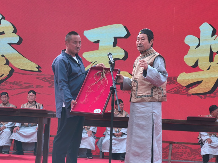 “參王評選”環節,待選人參依次被參把頭帶上臺,在經濟掌秤的引導下展示、介紹自己的山參,經濟掌秤和副掌秤對其山參進行稱重,同時由賬房先生記下重量。