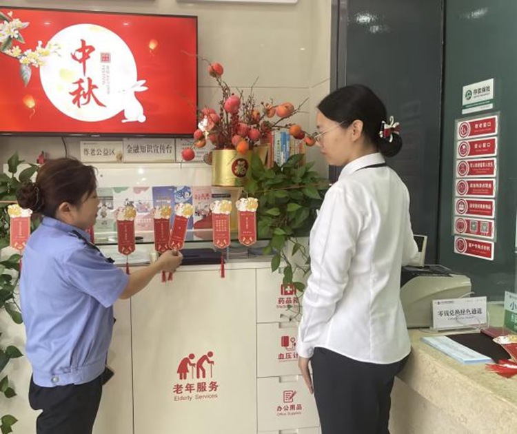 大橋支行為前來辦理業務的用戶送上了精美禮品和貼心祝福,通過介紹中秋節的來歷、民間傳說和文化習俗,讓大家更加了解中國傳統文化,感受傳統節日的魅力。結合金融教育宣傳月,為用戶講解金融知識,提醒用戶有效防范電信詐騙,宣講存款保險、反詐知識以及該行最新的電子支付相關優惠政策等,讓用戶感受到了節日氣氛的同時,進一步拓寬用戶金融知識面,提高用戶金融風險防范能力。