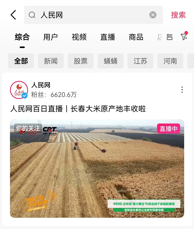 長春大米·長春鮮食玉米原產地豐收慢直播活動由人民網、長春廣播電視臺、長春市糧食和物資儲備局等單位聯合主辦,活動納入人民網“萬商萬品 萬象煥新——百日直播行動”,通過總粉絲量超1億的人民網抖音號、視頻號、快手號進行直播。