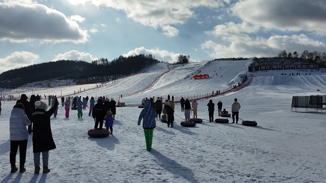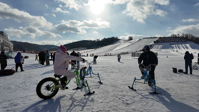 在戲雪樂園內(nèi),風馳電掣的雪地摩托車讓人領(lǐng)略速度的快感,俯沖而下的滑雪圈載著一路歡樂的笑聲,冰上自行車騎行讓人流連忘返……游客在這里盡情享受冰雪帶來的放松與樂趣。