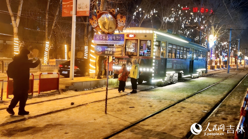 2月5日,吉林長(zhǎng)春華燈初上,54 路文旅列車的車身霓虹與街邊的火樹(shù)銀花相映成趣,節(jié)日氛圍拉滿,游客紛紛拍照留念。人民網(wǎng)記者 王帝元攝