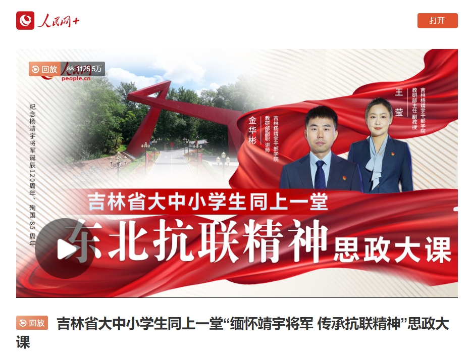這場思政大課以直播的形式在“人民網+”客戶端開講,人民網吉林頻道PC端、人民網吉林視頻號、人民網吉林抖音號同步進行,吉林省大中小學生積極參與,反響熱烈,直播課程在線人數達到1200余萬人次。《同上一堂“緬懷靖宇將軍 傳承抗聯精神”思政大課開講!》稿件被重點范圍網站在雙首頁要聞區推送。