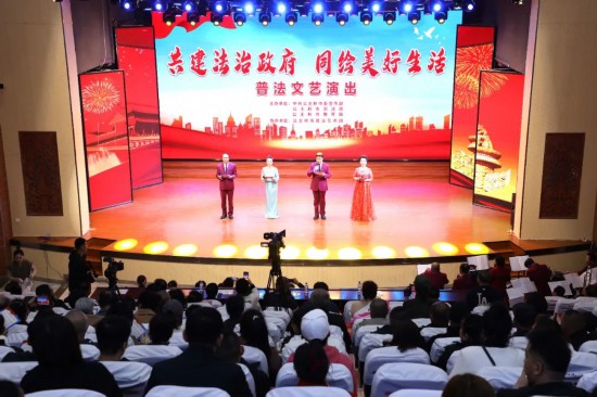 當《花開中國》的悠揚旋律在劇場流淌,LED大屏上《中華人民共和國民法典》書頁如花綻放,瞬間點燃全場熱情。說唱表演《共建法治政府》節奏明快,青年演員用方言快板與電子音樂混搭,將行政執法規范等專業術語化作朗朗上口的法治Rap,引得觀眾隨節拍擊掌應和,讓大家在欣賞藝術的同時,也接受了一次深刻的法治教育。
