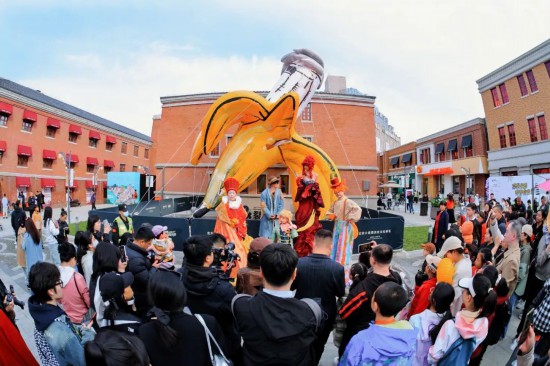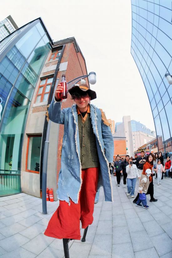 街區(qū)一側(cè),烏鎮(zhèn)戲劇節(jié)原班人馬帶來的高蹺巡游正熱鬧上演——2米多高的機(jī)械恐龍搖頭晃腦、“橫行霸道”地穿行于紅磚老巷,巨型《綠野仙蹤》鐵皮人踏著歡快的音樂與孩子們擊掌,踩著高蹺的“稻草人”則不停與大家揮手,隊(duì)伍里的火烈鳥輕輕啄了一下游客的手機(jī),引得游客陣陣驚呼。