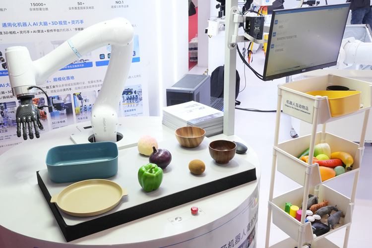 在長春電子科技學院展臺,工作人員正在展示梅卡曼德機器人的功能,只需要用語音對它發出指令,它就能在無規則放置的物體模型中,自動識別出需要抓取的物體并精準放到指定位置。
