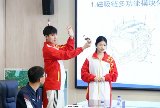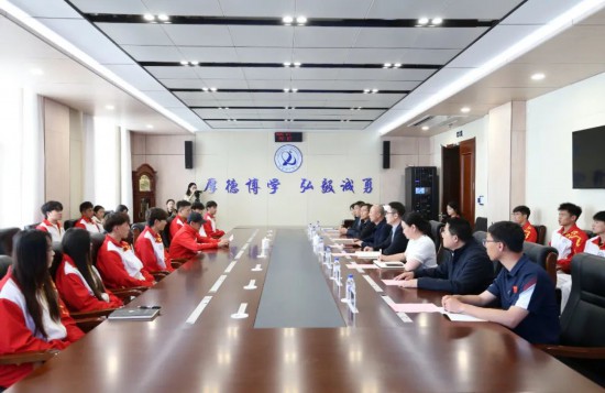 冰雪學院副院長王楷鈞匯報了學校在冰雪人才培養方面的成果。楊明澤老師帶領學生團隊介紹了滑雪用具研發工作。單兆鑒先生對學生科創項目和學校冰雪事業發展提出指導性意見和建議。